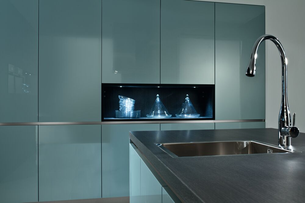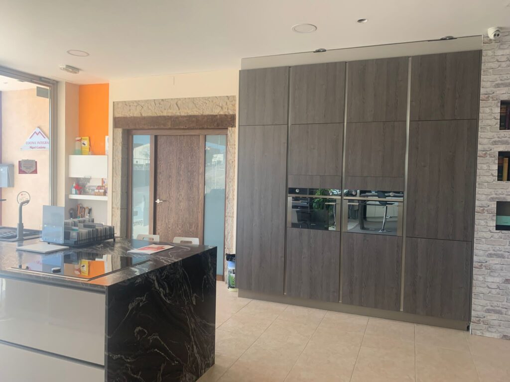 Häcker Systemat art laser satén brillo.Combinada con Toronto gris veteado. Puerta Laser Soft brillo satén lacada a una cara, combinada con puertas Toronto gris veteado. Tiradores con sistema gola. Zona de columnas compuesta por: columna despensero con estantes, columna para horno de 45cm, columna para microondas de 45cm y columna con cestos interiores extraíbles.…